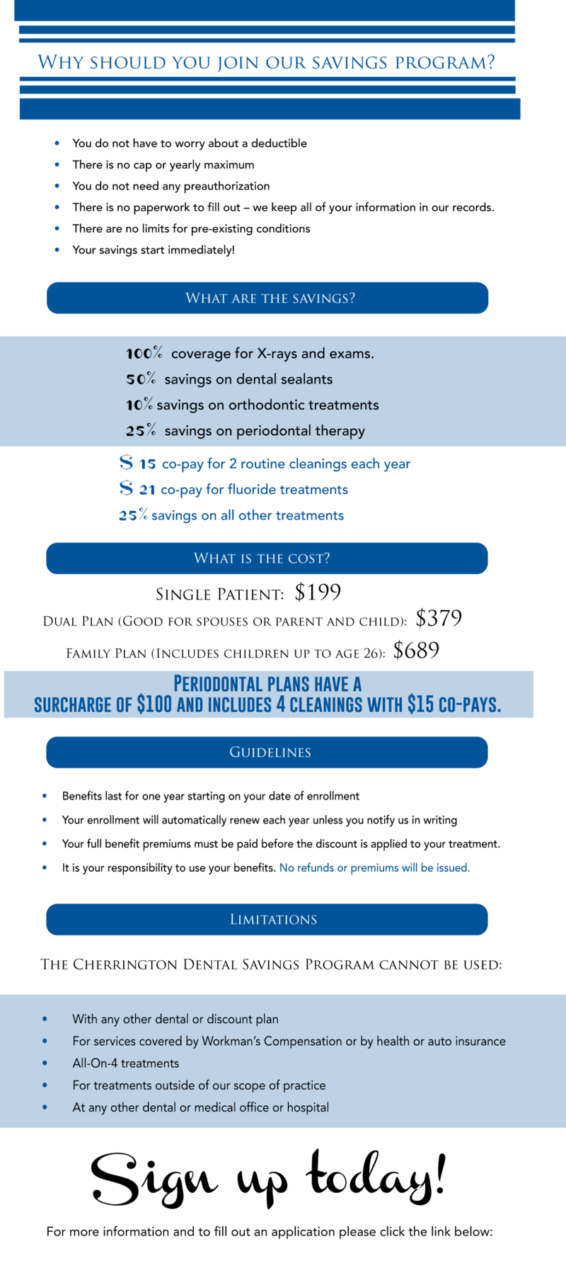 We are excited to offer our patients an in-house savings program for those who do not currently have dental insurance. Under the Cherrington Dental Savings Program, singles, couples and families can save on exams, X-rays, cleanings and other treatments. There are no maximums or deductibles and no eligibility requirements or waiting periods. The dental care you need is within your reach!